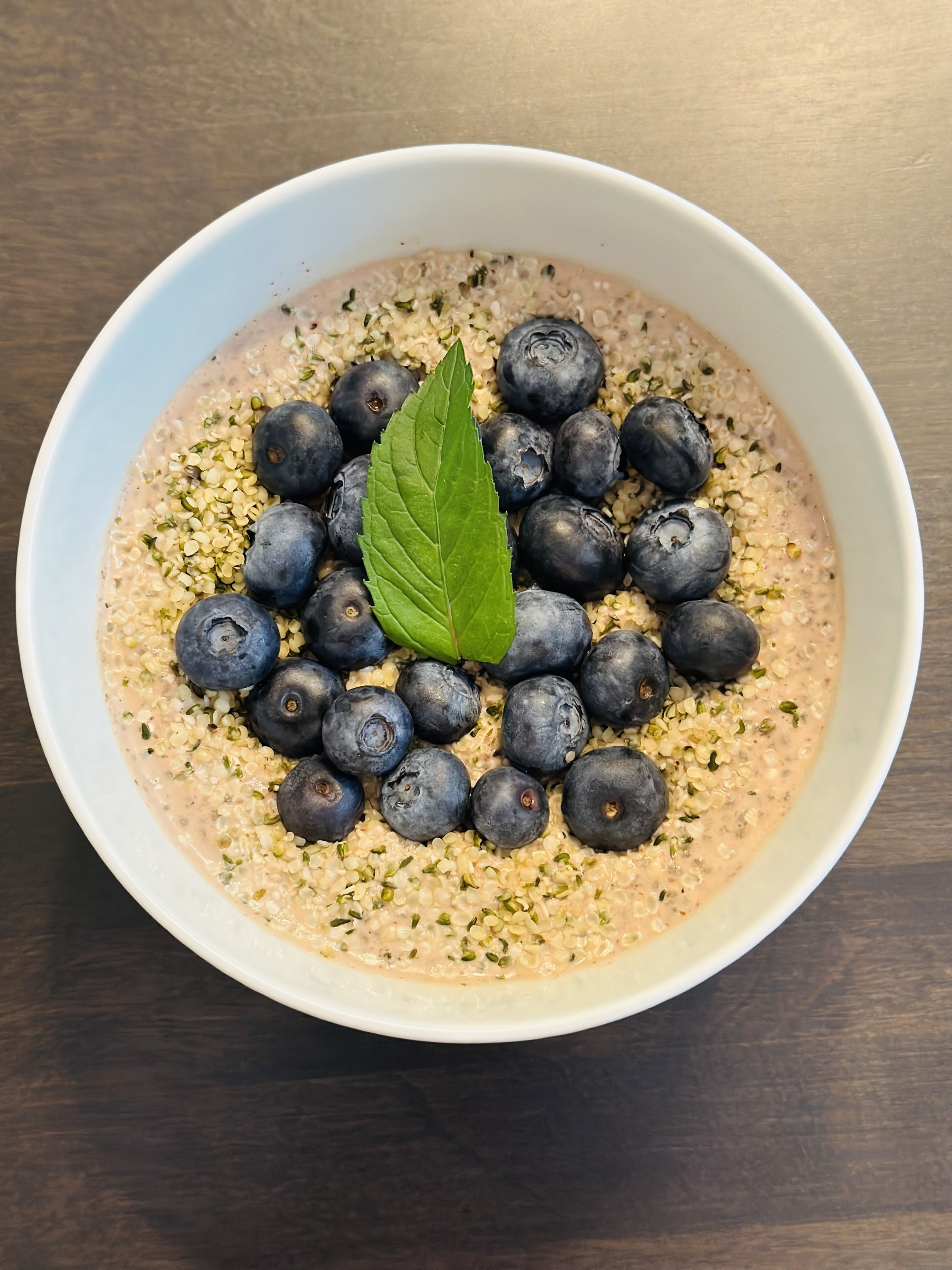 Portion out 1 serving in a bowl and top with 1 tbsp hemp hearts and organic blueberries.