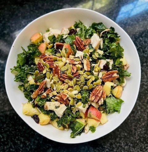 Remove the stem, cut the kale, and place it in a large bowl. Sprinkle with salt and massage the kale for 1 – 2 minutes. Add cubed apple and chicken, follow with pumpkin seeds, pecans, and cranberries. Top with the dressing and mix everything together.